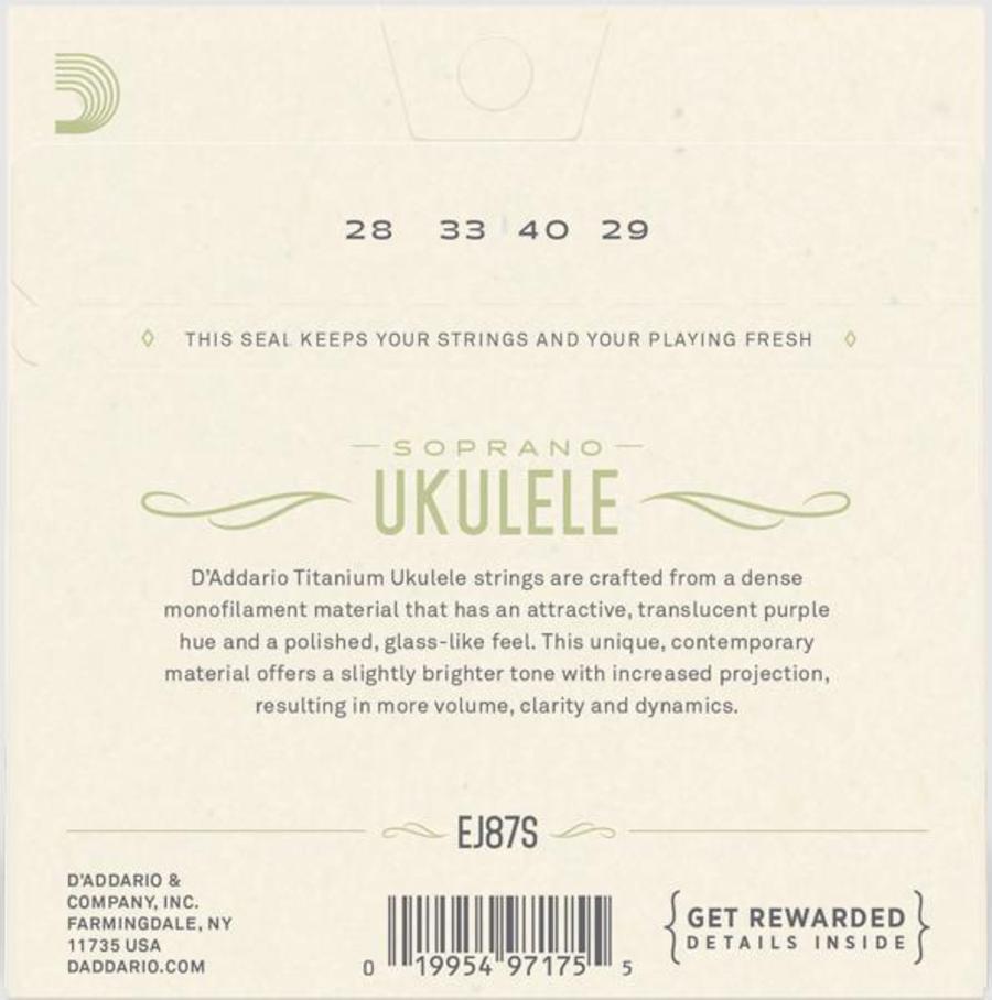 Комплект EJ87S разработан специально для укулеле сопрано. Струны изготовлены из титанового материала и оптимизированы для строя GCEA. Струны для укулеле Titanium изготовлены из плотной мононити с привлекательным фиолетовым оттенком и гладкой, похожей на нейлон, поверхностью. Этот уникальный материал особенно хорошо подходит для укулеле, поскольку его яркое звучание позволяет увеличить громкость, четкость и динамику инструмента.