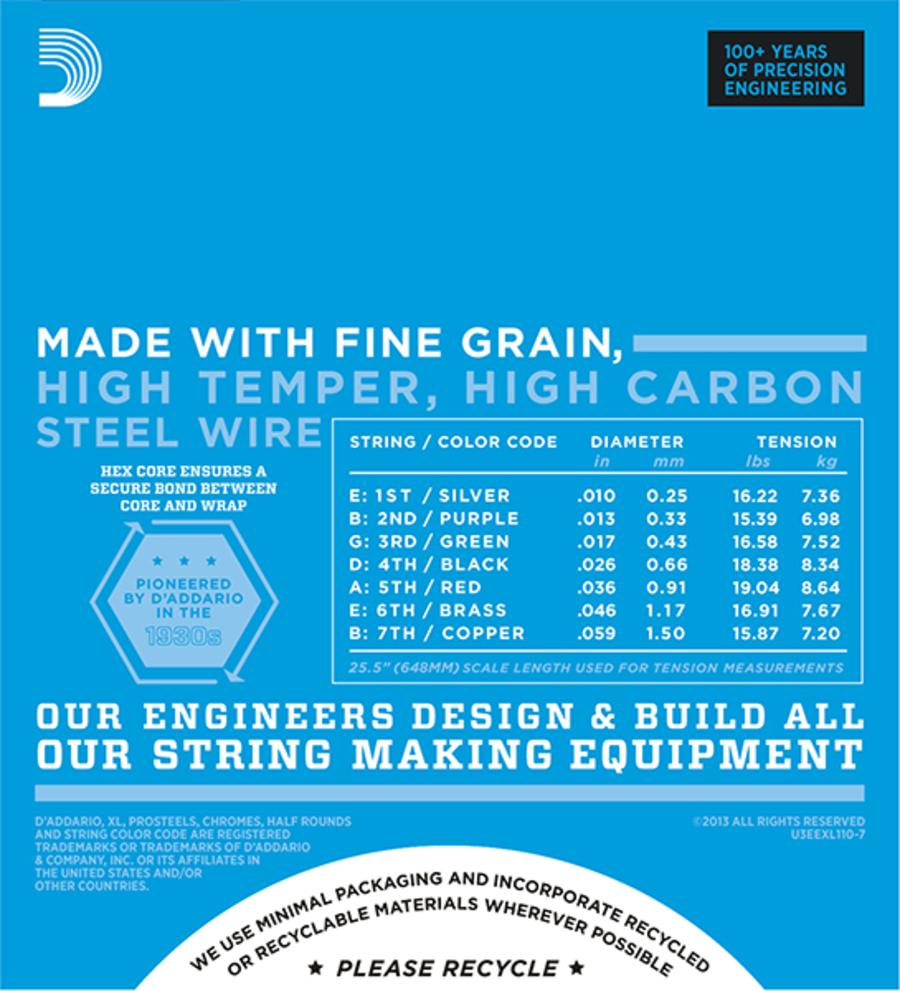 EXL110-7, Самый продаваемый комплект струн для 7-струнных гитары, идеальное сочетание звука, отдачи и долговечности. Подходит для большинства 7-струнных электрогитар. Эти струны, с ярким звуком и удивительной интонацией - выбор рок-музыкантов по всему миру! Струны XL Nickel Wound, самые популярные струны D'Addario для электрогитар. Высокоточная обмотка из никелированной стали на шестигранном керне из высокоуглеродистой стали. В результате струны дают продолжительный, выделяющийся яркий звук с прекрасной интонацией, который подходит для широкого круга гитаристов, играющих в разных музыкальных стилях.