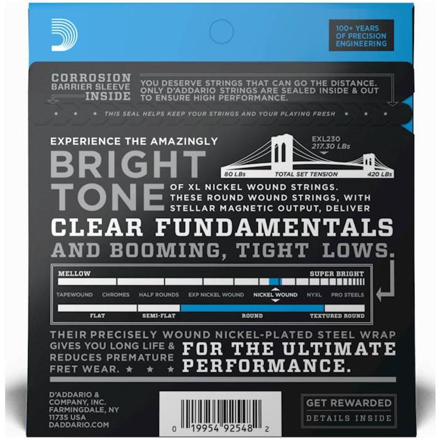 D'ADDARIO EXL230 – это комплект струн D'Addario самого большого калибра для бас-гитары, обеспечивающий максимальную громкость и отчетливо яркое, возбуждающее звучание. Великолепно подходит для пониженной настройки. Струны D'Addario XL с никелевой обмоткой для электрической бас-гитары заслужили мировую известность как «Выбор исполнителя» среди музыкантов всех жанров и стилей, играющих на басовых инструментах. Обмотка всех струн серии XL выполняется с прецизионной точностью на станках с цифровым управлением, что обеспечивает превосходную интонацию, чистое основное звучание и непревзойденную наполненность. Все струны выполняются в обмотке из стали с никелевым покрытием, получившим известность за отчетливо яркое звучание и превосходные магнитные свойства, обеспечивающие универсальность применения и гибкость звучания для музыкантов любых стилей.